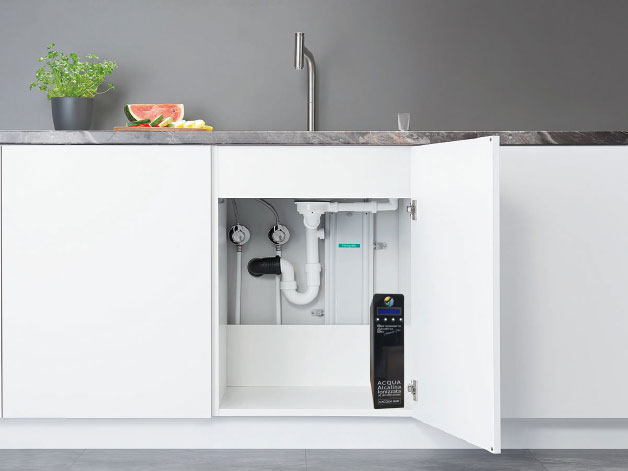 Benessere Alcalino Bio "Advanced Plus" è facilmente installabile nel vano sottolavello in posizione verticale o orizzontale, o in orizzontale (sotto lo zoccolo) rendendo agevole il collegamento alla rete idrica ed elettrica del dispositivo.